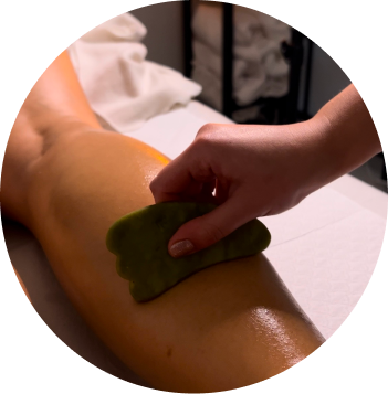 Masaż ciała z pomocą kamienia Gua Sha aktywuje siły samouzdrawiające i pobudza krążenie krwi w skórze, pomagając jednocześnie usunąć głęboko zakorzenione złogi i zminimalizować nadmiar zatrzymywanej wody. Regularne stosowanie może długotrwale zredukować cellulit, wzmocnić tkankę łączną i poprawić elastyczność skóry. Masaż może również pomóc w zmniejszeniu napięcia i złagodzeniu bólu. Masaż obejmuje nogi, ręce, brzuch oraz górną część pleców.